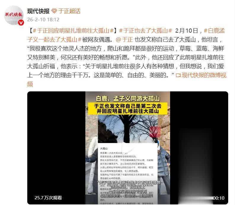面对“明星扎堆是否搞玄学”的种种猜测,娱乐圈著名“嘴替”于正坐不住了。他自己也前往了大孤山,并日发文回应,极力称赞那里地灵人杰,爬山跪拜是一项“好运动”,草莓和海鲜都十分鲜美,更有着“美好的畅想和祈愿”。他最终给出结论:“我们爱上一个地方的理由多种多样。这是简单的、自由的、美丽的。”